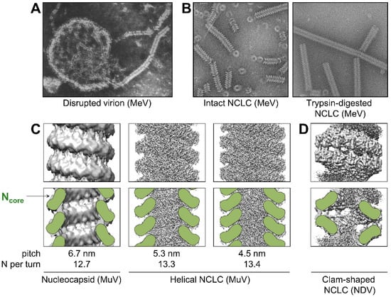 Conformations of nucleocapsids. (A) Disrupted measles particle by negative-stain microscopy. Republished with permission of Journal of Virology, from [116]; permission conveyed through Copyright Clearance Center, Inc. (B) Intact (left) and trypsin-digested (right) nucleocapsid-like complexes (NCLC) of MeV. Republished with permission of Journal of Virology, from [117]; permission conveyed through Copyright Clearance Center, Inc. (C) Top row: density maps of MuV nucleocapsid (left, EMDB: EMD-2630) and MuV NCLC (center, EMBD: EMD-31368; right, EMBD: EMD-31369). Bottom row: cross sections of the density maps shown above with schematic representation of Ncore in green. The pitch and number of N protomers per helical turn are indicated at the bottom. (D) Top: density map of a clam-shaped structure of NDV (EMBD: EMD-9793). Bottom: cross section of the density map shown above with schematic representation of Ncore in green.