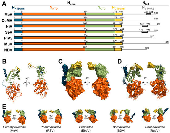 The sequence and the organization of Ncore are well conserved across the Paramyxoviridae family, while the sequence and length of Ntail vary greatly (Figure 4A). The structure of the N protein in an oligomeric, RNA-bound conformation (i.e., engaged in an NCLC) have been solved for PIV5 [17], MeV [18,20], NDV [19], cetacean morbillivirus (CeMV) [23], NiV [22], SeV [21], and MuV [126], while the structure of N in complex with PNTD (i.e., N0-P complex) was solved for NiV [24], MeV [25], PIV5 [26], and hPIV3 [27] (Figure 1).