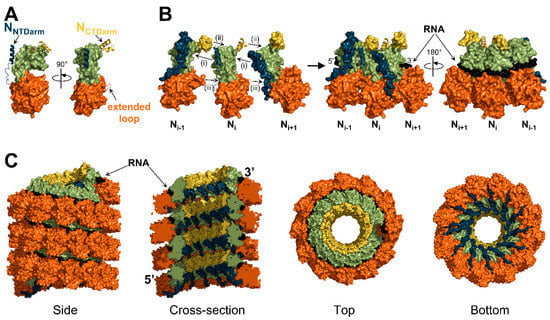 Using recombinant N proteins fused to a cleavable PNTD, NCLCs were generated in vitro after cleavage of the PNTD and incubation with either a six-nucleotide-long poly(A) RNA or an RNA corresponding to the first six nucleotides of the viral genome [20,23]. For both MeV and CeMV, NCLCs adopt a helical conformation with the RNA hexamer in the same phase register. These structures suggest that the first two nucleotides of the viral genome point toward the solvent and that the 3′ end of the genome is accessible to the viral polymerase (Figure 6B). This register is in agreement with data showing that cytidines at positions 1 and 6, which are both in “out” positions, are more sensitive to chemical modifications [144].