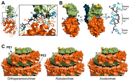 Position of the RNA. (A) Cartoon representation of MeV nucleoprotein bound to the first six nucleotides of the genome (5′ end) (PDB: 6H5S). The RNA and the residues implicated in the binding to the RNA are represented with sticks. The bases of the RNA are shown in blue, the backbone in black, and the phosphates in red. Residue Q202 is shown in yellow. (B) Same as (A) with the nucleoprotein in surface representation. (C) NCLCs of CeMV are shown in surface representation (reconstitution of the helix from PDB: 7OI3). For each subfamily, the consensus sequences of the promoter elements (PE1 and PE2) are shown in white. Well-conserved nucleotides are in capital letters. Bases in “out” positions are underlined. For N, same color code as in Figure 4.