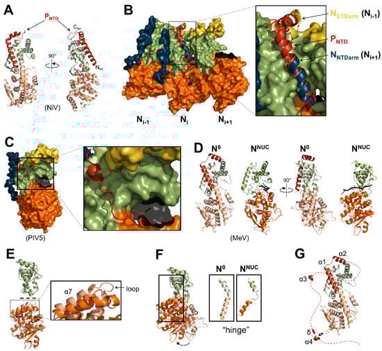 The first 50 residues of P (herein referred to as PNTD) of paramyxoviruses contain a conserved α-MoRE [57,59,62,167] that adopts an alpha-helical structure upon binding to Ncore (Figure 8). The structures of the N0-PNTD complex of NiV [24], MeV [25], PIV5 [26], and hPIV3 [27] were solved by X-ray crystallography (Figure 8A–D). To crystallize the complex in a monomeric and RNA-free state, the NNTDarm and NCTDarm were removed (with the exception of MeV in which the NCTDarm was included). For all three viruses, PNTD binds to NCTD in the groove occupied by the NNTDarm of the adjacent Ni+1 protomer in the nucleocapsid conformation (Figure 8B). The interactions between the groove and the PNTD or the NNTDarm are both of hydrophobic nature. For MeV and NiV, the first alpha-helix is followed by a second alpha-helix segment that binds the top of the NCTD in place of the NCTDarm of the adjacent Ni-1 protomer (Figure 8B). Contrary to MeV, hPIV3, and NiV, the PNTD of PIV5 extends on its N-terminus and reaches the RNA cavity, potentially directly inhibiting binding to the RNA (Figure 8C). Inhibition of the binding of the arms of the adjacent N protomers by PNTD is a conserved feature among mononegaviruses [131,137,168,169,170,171,172].