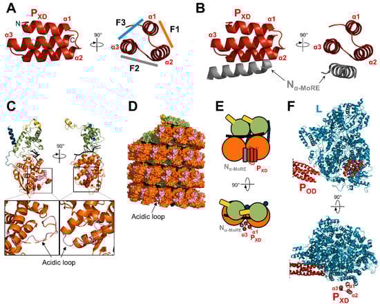 Interaction network of PXD. (A) Structure of MeV PXD (PDB: 1T6O). The three faces of the “prism” are indicated (F1, F2, F3). F1, F2, and F3 are shown with a color code corresponding to the color used to draw the protein partner. (B) Structure of MeV PXD in complex with Nα-MoRE (PDB: 1T6O). (C) Structure of a protomer of MeV N, as observed in the NCLC (PDB: 6H5Q) with the RNA shown in black. Amino acids shown as red spheres correspond to CDV N residues that once mutated restore the growth of a recombinant CDV bearing deletions in the NCDR [191]. The amino acids corresponding to the residues of NiV identified as important for the interaction with PXD are shown as pink spheres [192]. Bottom: enlargements of the NNTD with the acidic loop shown in pink. (D) Surface representation of a nucleocapsid-like complex of MeV (reconstituted from PDB: 6H5Q) with the acidic loop shown in pink. (E) Schematic representation of two adjacent N protomers bound to PXD in complex with Nα-MoRE. (F) Structure of the polymerase complex of PIV5 (PDB: 6V85). For panels (C–E), N protomers are colored according to the color code in Figure 4.