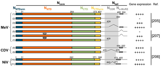 - Cox, R.M.; Krumm, S.A.; Thakkar, V.D.; Sohn, M.; Plemper, R.K. The structurally disordered paramyxovirus nucleocapsid protein tail domain is a regulator of the mRNA transcription gradient. Sci. Adv. 2017, 3, e1602350. [Google Scholar] [CrossRef] [PubMed]