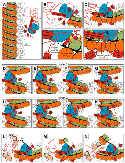 Unlike the distantly related members of the Articulavirales and Bunyavirales orders for which the polymerase can directly bind the extremity of the viral genomes, the viral polymerase of mononegaviruses cannot interact with its nucleocapsid template without its cofactor P [43]. Moreover, the genomes of mononegaviruses are deeply encased in helical nucleocapsids, thus raising the question of how the polymerase accesses the RNA.