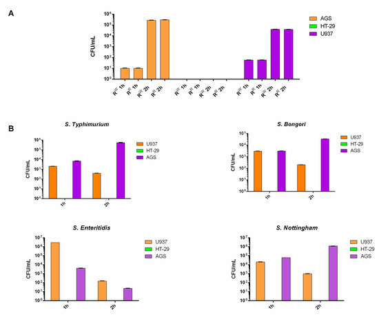 RR and RW host cell colonization. (A) AGS, U937 and HT-29 cell lines were infected with the bacteriophage-resistant RR or RW strains for 1 and 2 h. (B) AGS, U937 and HT-29 cell lines were infected with Salmonella typhimurium, bongori, enteritidis or nottingham for 1 and 2 h. Results are reported as Log10 CFU/mL and represent the mean ± SD of three experiments, each performed in triplicate.