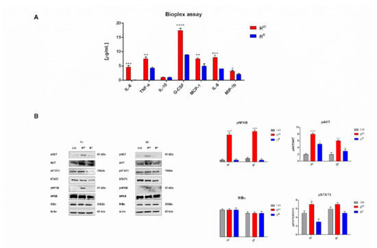 Phage-resistance curbs AGS-induced inflammatory response. (A) Cytokines IL-6, TNF-α, IL-10, G-CSF, MCP-1, MIP-1β and IL-8 were measured by Bio-plex assay in AGS cells culture medium after incubation for two hours with RR or RW strains. Results are expressed as pg of cytokines secreted in mL of cell medium. Values were normalized to the basal activity (CTR) and represent mean ± SD of at least three independent experiments, each performed in triplicate (* p < 0.05; ** p < 0.01; *** p < 0.001; **** p < 0.0001). (B) Western blot and densitometric analysis of the ratio pNF-kB/NF-kB; pAkt/Akt; pSTAT3/STAT3. Actin was used for normalization. Graphs report the result of three independent experiments and represent mean ± SD (* p < 0.05; ** p < 0.01; *** p < 0.001; **** p < 0.0001).