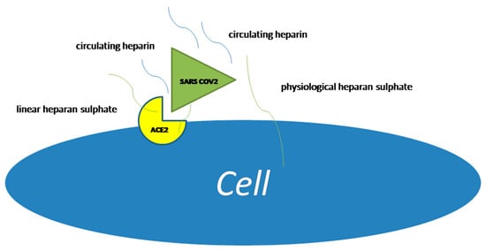 On the other hand, heparan sulphate, the main component at cell surfaces and in the extracellular matrix of most animal tissues, can interact with a large variety of protein and cells, so takes a relevant role in disease processes. Most functions of heparan sulphate depend on ionic interactions, with a variety of proteins, including growth factors, cytokines, and their receptors [10]. Furthermore, heparan sulphate is also able to interact with SARS-CoV-2 before its binding to angiotensin converting enzyme receptor type 2 (ACE-2) (Figure 1). Several studies have confirmed that these mechanisms are effective for SARS-CoV-2, and that SARS-CoV-2 spike protein interacts with both cellular heparan sulphate and angiotensin-converting enzyme 2 (ACE2) through its receptor [11].