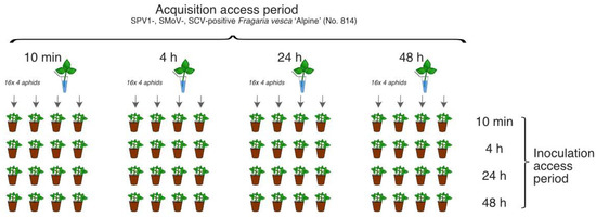 For SPV1 transmission assays, 256 individual A. gossypii wingless adults were divided into 16 groups (each of 16 individuals) with varying acquisition access periods (AAPs) and inoculation access periods (IAPs) of 10 min, 4 h, 24 h, or 48 h. Following feeding on the leaves of ‘Alpine’ No. 814 plant, the aphids were transferred to 64 seed-grown ‘Alpine’ plants (four aphids per plant). Altogether, 16 variants of the transmission trials were conducted, and each experiment was performed in four replicates at 24 °C (Figure 1).