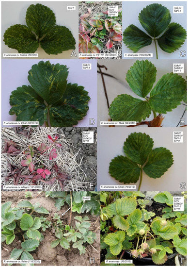 Virus-like disease symptoms on strawberries: (A,D) irregular vein clearing; (B) premature reddening of older leaves and chlorosis of young leaves; (C) chlorosis of veins at the leaf margin; (E,G) mosaic; (F) premature dieback and reddening of older leaves together with weakening of the plant; (H) stunting (arrow); (I) chlorosis of the whole plant. The identification of plants, cultivars, and viruses detected by RT-PCR is indicated in the figure. SMYEV—strawberry mild yellow edge, StrV1—strawberry virus 1.
