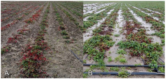 Fields with strawberry plants affected by decline syndrome at P-1-F and Z-1-F sites in Pilsen (A) and the Zlín (B) regions.