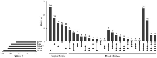 An Upset plot of the coinfection of 332 plant samples by SMoV, SCV, SMYEV, StrV-1, and SPV1.