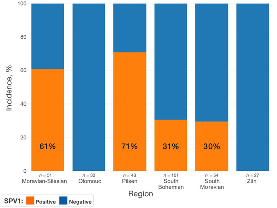 Altogether, SPV1 was detected in a breeding nursery (Liberec Region) and in 16 out of 25 production strawberry farms. The only regions where SPV1 was not detected were Olomouc and Zlín (Figure 5).