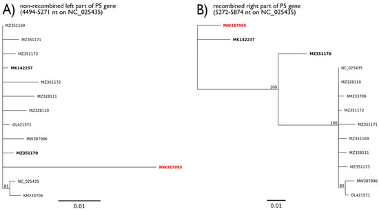 Phylogenetic comparison of non-recombinant (A) and putative recombinant (B) parts of the P5 nucleotide sequences for the 5276 nt breakpoint. The gene was divided according to the recombination points obtained by RDP5 program (the breaking point on 5276 nt of alignment). Potential recombinants are in bold, the Rujana SPV1 isolate (the Czech recombinant) is in red, nucleotide positions are according to the NC_025435 reference.