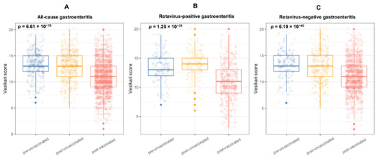 Ruuska and Vesikari severity scores among children hospitalised with gastroenteritis at QECH in Blantyre, Malawi before (December 2011 to October 2012) and after (November 2012 to October 2019) introduction of Rotarix®. (A) Severity scores in all-cause gastroenteritis cases. (B) Severity scores in rotavirus-positive cases. (C) Severity scores in rotavirus-negative cases. Testing the null hypothesis that the severity scores have the same distribution in all three groups was highly statistically significant (p = 6.61 × 10−78, 1.25 × 10−39, 6.10 × 10−40) for (A–C), respectively; Kruskal–Wallis test). The p-value for observing the data under the null hypothesis of no different distribution between groups was 0.260 using a Wilcoxon rank-sum test when only comparing the pre-Rotarix with the post-Rotarix®-unvaccinated group (for all gastroenteritis cases). Vesikari scores = Ruuska and Vesikari scores.