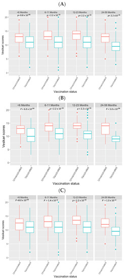 Comparison of Ruuska and Vesikari severity scores among children requiring hospitalisation with gastroenteritis at QECH in Blantyre, Malawi from December 2011 to October 2019 stratified by Rotarix® vaccination status between different age groups (Kruskal–Wallis test). (A) Severity scores in all-cause gastroenteritis cases (Rotarix®-vaccinated, n = 248, 1128, 712 and 136; Rotarix®-unvaccinated, n = 121, 386, 311 and 117 in less than 6-, 6–11-, 12–23- and 24–59-month-old children, respectively). (B) Severity scores in rotavirus-positive cases (Rotarix®-vaccinated, n = 61, 353, 213, 25; Rotarix®-unvaccinated, n = 69, 156, 112 and 16 in less than 6-, 6–11-, 12–23- and 24–59-month-old children, respectively). (C) Severity scores in rotavirus-negative cases (Rotarix®-vaccinated, n = 187, 773, 498 and 110; Rotarix®-unvaccinated, n = 52, 225, 198 and 101 in less than 6-, 6–11-, 12–23- and 24–59-month-old children, respectively).