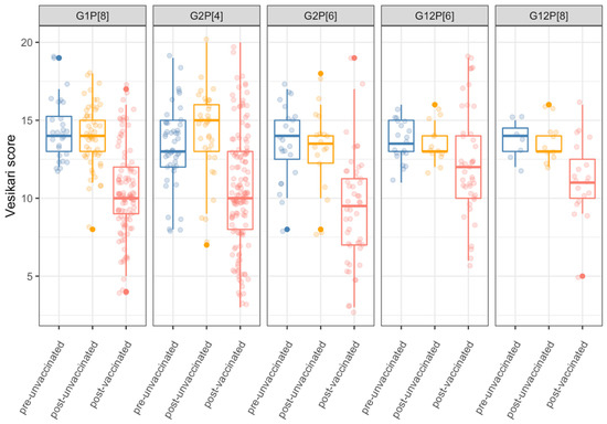 Comparison of severity scores in Rotarix®-vaccinated and Rotarix®-unvaccinated hospitalised children at Queen Elizabeth Central Hospital in Blantyre, Malawi presenting with gastroenteritis stratified by frequently detected combined G and P rotavirus genotypes. Vesikari scores = Ruuska and Vesikari scores.