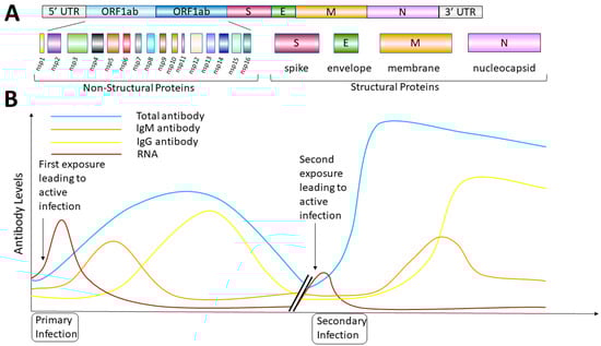In addition to approaches to diagnose active virus infection, there are also serologic testing approaches []. Typical serologic tests focus on the detection of human antibodies recognizing viral proteins, and these include IgM, IgG (Figure 1B) or total antibody levels []. These antibody tests provide insight as to whether or not an individual has been exposed to SARS-CoV-2 or vaccinated against the S protein []. These tests can be lower in cost and they can also be amenable to rapid point-of-care testing from either blood or saliva. However, the generation of these tests takes longer because they require biological reagents, including viral proteins antigens, and also capture antibodies. This differs from nucleic acid testing, where PCR primers can be generated very quickly and are very specific for a distinct viral genome. Table 1 describes the utilization of these tests in the clinical evaluation of a patient that is suspected to be infected with SARS-CoV-2.