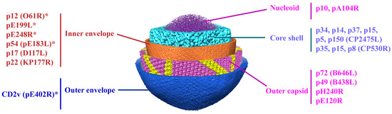 - Alejo, A.; Matamoros, T.; Guerra, M.; Andrés, G. A proteomic atlas of the African swine fever virus particle. J. Virol. 2018, 92, e01293-18. [Google Scholar] [CrossRef] [Green Version]