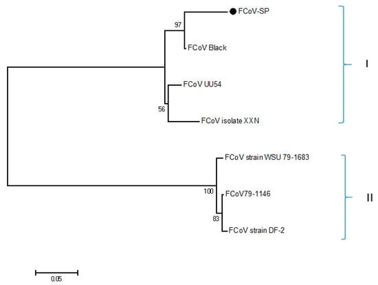 Phylogenetic analysis. Phylogenetic tree derived from amino acid sequences was constructed by MEGA version 5.2 using the neighbor-joining method with the p-distance model, 1000 bootstrap replicates. ● represents FCoV-SP identified in our study. I: type I, II: type II.