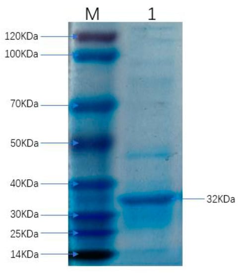 SDS-PAGE analysis of the purification of FCoV-SP. Lane M: protein marker (14 kDa–120 kDa); Lane 1: FCoV-SP protein.