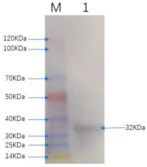 Western blot analysis of FCoV-SP. Lane M: protein marker (14 kDa–120 kDa); Lane 1: the purified FCoV-SP protein.