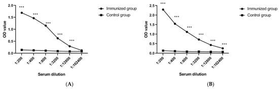 In serum tests using the established indirect ELISA, the titers of antibodies in mice and rabbits after the third round of enhanced immunity were different from those in the controls (p < 0.05) (Figure 4A,B).