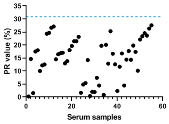 The 55 negative serum samples were tested to determine the cut-off value of the iELISA. The average PR value of negative samples was statistically analyzed and calculated as 14.75 and the standard deviation (SD) was 8.04. The cut-off value was determined as the mean value of the negative serum + 2 × SD. All PR values of the serum samples > 30.83 were determined to be positive. If not, the serum was considered to be negative (Figure 5).