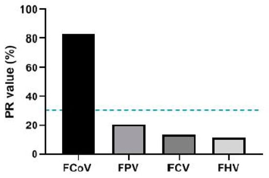 Specificity test of the iELISA. The blue dashed line indicates the PR value (30.83). FPV: feline panleukopenia virus, FCV: feline calicivirus, FHV: feline herpesvirus, PR: percentage reactivity.