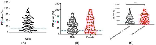 Field serum samples underwent anti-FCoV antibody testing. (A) In total, 107 serum samples were analysed. A total of 75 samples were antibody positive. (B) Cats of different genders were analysed. Of all cats, 46 (67.64%) males were antibody positive and 29 (74.36%) females were antibody positive. p > 0.05. (C) Cats of different ages were analysed. Of all cats, 34 (62.96%) cats of 12 months of age or younger and 41 (77.36%) cats older than 12 months were antibody positive. Violin plots, medians, and quartiles were analyzed using GraphPad Prism software version 8.0 for Windows (San Diego, CA, USA). The blue dashed line indicates the PR value (30.83). *** p < 0.05.