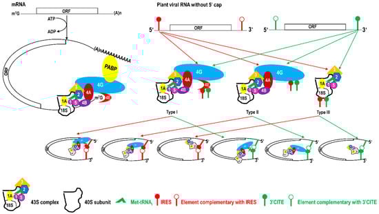 To study the translation of viral proteins, the characteristics of the 5′ and 3′ ends of the viral RNA are the primary factors to be considered. If viral RNA has a capped 5′ end and polyadenylated 3′ end, it can express the viral protein through the canonical ribosome scanning model as cellular mRNA. In the ribosome scanning model of eukaryotic cellular mRNA, the 7-methylguanosine cap at the 5′ end of cellular mRNA is first bound by eIF4E, part of the eIF4F complex, which recruits the 43S preinitiation complex, including the 40S small ribosomal subunit, eIF2–GTP–Met-tRNAi ternary complex, along with eIF1, eIF1A, eIF3, and eIF5. The resulting 48S preinitiation complex is then scanned from 5′ to 3′ in an ATP-dependent manner until the charged initiator Met-tRNAi is base-paired with an AUG start codon surrounding by suitable context sequences. A number of initiation factors are then displaced to allow the joining of the 60S large ribosomal subunit to form the complete 80S ribosome to initiate translation. The 3′ poly (A) can be bound by PABP, which also binds eIF4G to cyclize the cellular mRNA, greatly enhancing translation by avoiding cellular mRNA decay and cyclic utilization of ribosomal subunits [,].