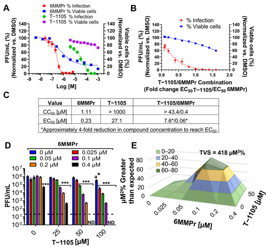 We determined EC50 and CC50 values for individual 6MMPr and T-1105 treatments (Figure 1A−E). Huh7 cells were inoculated with DENV2 and treated with increasing concentrations of either 6MMPr (0–0.4 µM) or T-1105 (0–1 mM). At 72 h post-treatment (hpt), supernatants were analyzed for infectious particles by plaque assay and that data were used to determine EC50 values for each compound. In parallel, the viability of the compound-treated non-infected cells was determined to assign CC50 values for each compound (Figure 1A,C). Both 6MMPr and T-1105 inhibited viral replication in a concentration-dependent manner resulting in a 0.23 µM EC50 for 6MMPr and 27 µM EC50 for T-1105 (similar to EC50 reported previously [13]). In addition, EC50 values were determined for the combination treatment (Figure 1B). The dose for each compound in the combination treatment was based upon their respective EC50 values (0.23 µM for 6MMPr and 27 µM for T-1105). The final concentration for each compound in the combination was 0, 0.08, 0.1, 0.2, 0.4, 0.6, 0.8, 1, 1.2, 1.4, or 1.6 times their respective EC50 values. The combination with a 50% reduction in viral titer was 7.6 µM T-1105/0.06 µM 6MMPr, a four-fold reduction in compound concentration compared to their EC50 values when used alone with no effect on cell viability (Figure 1B,C).
