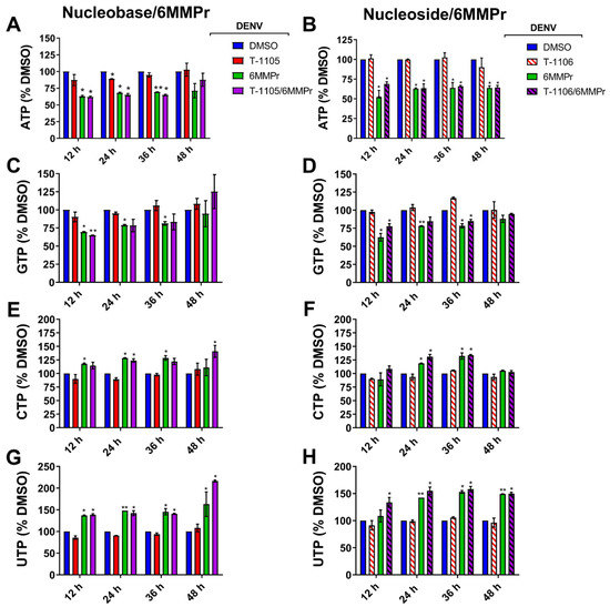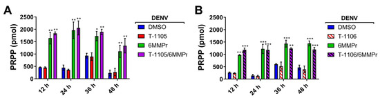 PPAT inhibition by 6MMPr results in an accumulation of PRPP as well as a reduction in cellular purine NTP biosynthesis [41,42]. We examined the effect of the 6MMPr treatment on the levels of PRPP and NTPs in DENV-infected Huh7 cells. The 6MMPr treatment alone or in combination with T-1105 or T-1106 (Figure 4) reduced the levels of endogenous purine NTPs in DENV-infected cells compared to cultures treated with DMSO or T-1105 or T-1106 alone. Increases in the pyrimidine TPs CTP and UTP were observed during 6MMPr treatments in combination or alone (Figure 4), consistent with a previous report [43]. Finally, the 6MMPr treatment alone or in combination increased the accumulation of endogenous PRPP at all timepoints (Figure 5).