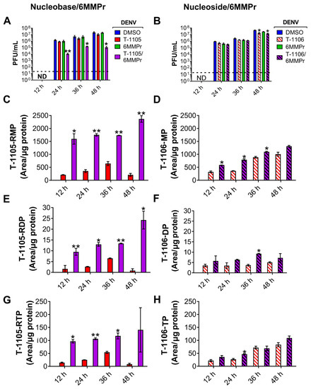 6MMPr increases the conversion to the active form of nucleobase T-1105 but not of its nucleoside analog T-1106. Huh7 cells were inoculated with DENV-2 and treated with DMSO, the nucleobase T-1105 (52.5 µM), 6MMPr (0.1 µM), and the T-1105/6MMPr co-treatment. After 12, 24, 36, and 48 hpt, supernatants were analyzed for viral titers (expressed as PFU/mL in (A) and cells were fixed and prepared for LC/MS/MS analysis of T-1105 ribonucleoside-5’-monophosphate (T-1105-RMP in (C)), T-1105 ribonucleoside-5´-diphosphate (T-1105-RDP in (E)), and T-1105 ribonucleoside-5´-triphosphate (T-1105 RTP in (G)). Similar assay was performed for the nucleoside T-1106 (150 µM) and co-treatment with 6MMPr. Graph in (B) indicates the viral titers. (D,F,H) correspond to the T-1106 5´ monophosphate (T-1106-MP), the T-1106 5´ diphosphate (T-1106-DP), and the T-1106 5´ triphosphate (T-1106-TP) forms, respectively. Mono-, di-, and tri-phosphate levels are expressed as the peak area normalized vs. the amount of total protein of each sample (area/µg protein). The plots represent the mean ± SEM of two independent experiments. * p ≤ 0.05; ** p ≤ 0.005. ND, none detected; black dotted line, limit of detection.