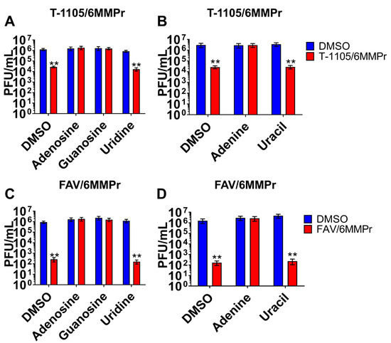 Adenosine, adenine, and guanosine block the antiviral effect induced by nucleobase/6MMPr combinations. DENV-inoculated Huh7 cells treated with DMSO, T-1105/6MMPr (52.5 µM/0.1 µM) (A,B), or favipiravir/6MMPr (275 µM/0.1 µM) (C,D) in the absence or presence of exogenous nucleosides (A,C) or nucleobases (B,D). The plots represent the mean ± SEM of viral titers expressed as PFU/mL from two independent experiments with samples performed in triplicate. ** p ≤ 0.005.