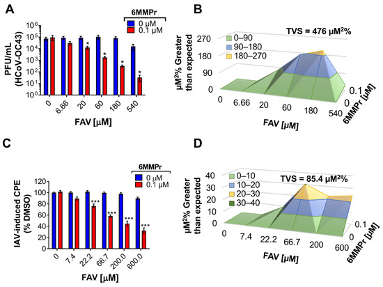 6MMPr increases the favipiravir antiviral potency against IAV (H1N1) and HCoV-OC43. (A) HCoV-OC43 titer of supernatants collected 72 hpi from Huh7 cells inoculated at MOI of 0.1 and treated with different concentrations of FAV in combination with 6MMPr or DMSO. Bars depict the mean ± SEM from two independent experiments conducted in duplicate. (B) The 3D plot indicating synergistic antiviral effect. (C) Cytopathic effects (CPE) induced by IAV in Huh7 cells inoculated at MOI of 0.2 and treated with increasing concentrations of favipiravir (FAV) in combination with 0.1 µM 6MMPr (red bars) or DMSO (0 µM, blue bars) for 48 hpi. The bars represent mean CPE normalized vs. DMSO-treated cells ± SEM of three independent experiments. *, p < 0.05; ***, p < 0.001. (D) The 3D plot indicating synergistic antiviral effect. Total volume of synergy = TVS, calculated at 99.9% confidence interval.