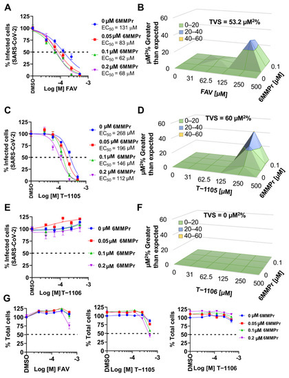 6MMPr synergistically enhances anti-SARS-CoV-2 activity of favipiravir. Vero-E6 cells were inoculated with SARS-CoV-2 at MOI of 0.01 for 72 hpi in the presence of 0, 31, 62.5, 125, 250, and 500 µM of favipiravir (FAV) (A), T-1105 (C), and T-1106 (E). The percent of infected cells was calculated by immunostaining of viral nucleoprotein and used to build infectious dose-response curves. EC50 values are indicated for favipiravir and T-1105 alone and in combination with 6MMPr. The 3D plots in (B,D,F) indicate synergistic antiviral effect or lack thereof for each combination. (G) Total number of cells quantified by DAPI staining from panel (A,C,E) was used to calculate % cell viability for FAV, T-1105, and T-1106 alone or in combination with 6MMPr. The graphs depict the mean ± SEM of two independent experiments with three biological replicates. Total volume of synergy = TVS. All TVS calculated at 99.9% confidence interval. Dotted black line indicates 50%.