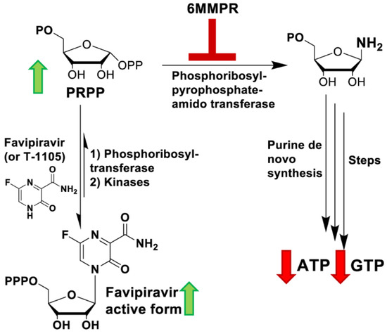 As summarized in Figure 11, 6MMPr inhibits the committed step of de novo purine biosynthesis by blocking the PPAT-catalyzed conversion of PRPP into 5′-phosphoribosyl-1-amine producing at least two important outcomes. One is a reduction in the endogenous levels of ATP and GTP and the second is the accumulation of PRPP [21,49,50,51] (Figure 4 and Figure 5). We propose that PRPP accumulation induced by 6MMPr increases the conversion of T-1105 to T-1105-RMP by a salvage pathway phosphoribosyltransferase and ultimately results in an increase in the subsequent RDP and RTP forms. Purine nucleobases can be converted to the RMP form via phosphoribosyltransferases as part of the cellular salvage pathway [22]. A nucleobase/salvage pathway-specific effect could explain the failure of a 6MMPr co-treatment to increase T-1106 nucleoside mono-, di-, and triphosphate forms because T-1106 conversion to the monophosphate form does not occur via the salvage pathway but through kinase phosphorylation.