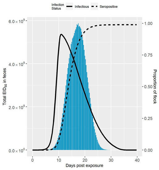 Viral shedding was simulated at the individual bird level, and allowed to vary over time, diverging from the assumption in classical epidemiological models of constant shedding during the infectious period [11]. The viral shedding model was extended to (1) approximate the amount of virus in manure over time, and (2) estimate the likelihood of observing higher (>30 and ≤40) and lower (≤30) threshold cycle (Ct) values following testing of 11 OP swabs sampled from turkeys in the house by rRT-PCR. This was done to investigate whether having LPAIV rRT-PCR results with Ct values approaching 40 could be used as a flock-level indicator that a previously positive flock is nearing recovery. The models were developed to provide insight into the transmission risk that infected flocks pose following LPAIV exposure, and to inform appropriate outbreak response strategies in order to minimize the risk of LPAI spread to other flocks.