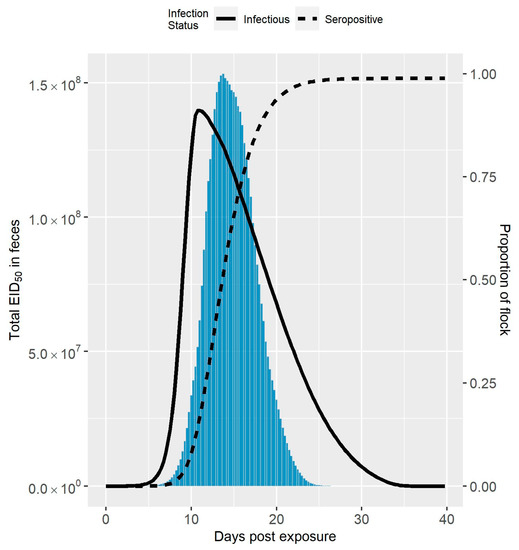 The of virus shed from cloacal routes simulated for individual birds based on the Iqbal et al. (2012) and Spackman et al. (2010) data was translated into the virus titer in manure by multiplying the exponentiated simulated by the average volume of feces produced in a simulation time period [8,9]. The milliliters of feces excreted in a simulation time period was approximated based on mean feed consumption by weight of adult turkey toms between 16 and 20 weeks of age [33]. The weight of feed was converted to volume of waste produced using a 1:1 conversion ratio for the mass of waste produced per mass of feed consumed [33], and the feces density derived from [34].