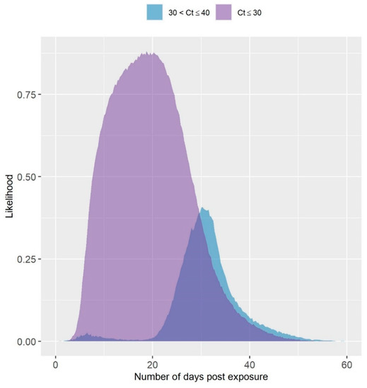 The likelihood of observing a Ct value ≤ 30 (i.e., a strong positive), and the likelihood of observing a Ct value > 30 but ≤40 (i.e., a weak positive) over time following the testing of a pooled sample of 11 OP swabs by rRT-PCR were estimated using forward simulation. The application of the testing protocol was simulated at each 0.25 day from the time of virus exposure until 80 days post exposure for 6000 transmission model iterations. The likelihoods were determined by the proportion of iterations with simulated Ct values falling within the desired ranges. The testing protocol consisted of a single pooled sample of 11 OP swabs. Dead birds were prioritized for sampling. If fewer than 11 birds had died, samples were taken from live birds until the total of 11 swabs was reached.