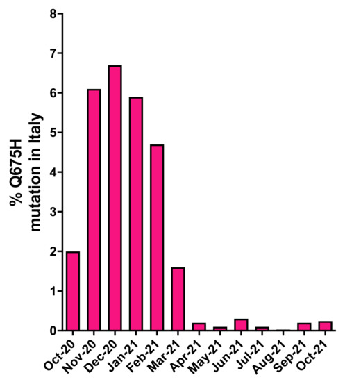 3.3. Occurrence of Q675H Mutation in Different VOCs