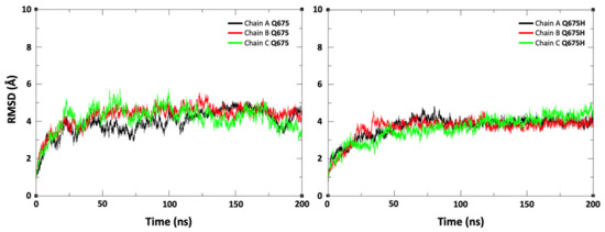 Based on our findings, we hypothesize that SARS-CoV-2 Q675H spike mutation may enhance viral fitness and host adaptation. Biocomputational studies were performed to explore the role of Q675H mutation in the context of the furin binding pocket. The Q675H mutation is located in the spike protein adjacent to the polybasic S1/S2 furin cleavage site 682-RRAR*S-686. The stability of the spike tertiary structure was evaluated using DynaMut web server [37]. Q675H mutation showed a positive (ΔΔG value is 0.665 kcal/mol) and a negative (ΔΔSVibENCoM value is –0.108 kcal.mol−1K−1) change in vibrational entropy energy between wild-type and mutant proteins. A ΔΔG above zero and a ΔΔSVibENCoM below zero represent protein stabilization and stiffening of the protein structure, respectively. To further characterize the structural stability and dynamic features of spike expressing Q675 or Q675H, we performed 200 ns molecular dynamics (MDs) simulations starting from the 6VXX (close conformation) charm-gui model (aa 1-1146) without glycans. Stabilities of the trimeric form of the Q675 and Q675H were examined using the root mean square deviation (RMSD) of C α atoms. The RMSD plot shows that the three chains of the Q675 and Q675H have a similar deviation of about 4 Å (Figure 5).