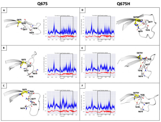 Then, the conformational ensembles of spike chains along the trajectories of MDs were analyzed representing protein backbone as a 3D regular curve, and characterized by curvature and torsion values per residue. We used the differential geometry (DG)-based representation of the protein structure [39] because it is optimal for backbone protein flexibility analysis and particularly advantageous for highly flexible regions of protein, such as the SARS-CoV-2 spike protein loop containing the furin cleavage site. The visual inspection of the curvature (κ) and torsion (τ) values observed on the furin cleavage site loop shows that compared to Q675 chains (Figure 6A–C), a lower structural variability in spanning residues ranging from 675 to 683 in the Q675H chains was observed (Figure 6D–F). Further analysis showed that Q675H forms a distinct H-bond network involving residues at position 676, 677, 678, and 679 that are localized near the Q675H residue (Figure 6).