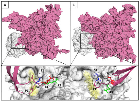 (Upper panel A and B) Furin and Q675 (left) or Q675H (right) models are shown in Connolly surface gray and fuchsia, respectively. (Lower panel A and B) The binding pose of the arginines of the furin cleavage site motif in P1-S1/P3-S4 substrate conformation of Q675 (left) and P1–S1/P4–S4 substrate conformation of Q675H into the corresponding binding pockets S1 and S4 are shown. The catalytic domain of furin is shown in yellow; the locations of the P1 (blue), P3 (green), and P4 (red) of arginine involved in the interaction with enzyme are shown in sticks, while their respective S1 and S4 pockets are labelled and indicated by an arc.
