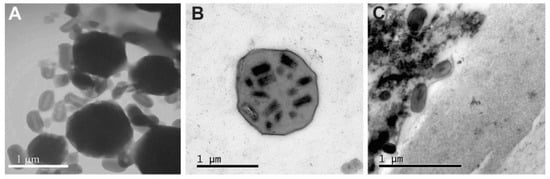 SporNPV and SporGV ultrastructural studies. Transmission electron micrographs showing OBs found in a naturally coinfected S. ornithogalli larva. (A). Natural mix of S. ornithogalli NPV and GV (negative staining). (B). S. ornithogalli NPV. (C). S. ornithogalli GV.