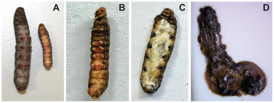 S. ornithogalli infected with SporGV and SporNPV. S. ornithogalli larvae have been individually infected with SporGV or SporNPV and the cadavers were photographed. (A). A healthy larva (on the right) next to a larva infected with SporGV (on the left). (B). Dead larva by SporGV. (C). Dead larva by SporGV with the abdomen opened with a scalpel to show its interior. (D). Dead larva by SporNPV.