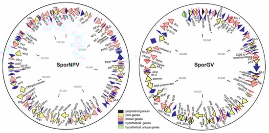 SporNPV and SporGV genomes. Physical maps of the genomes of SporNPV (left) and SporGV (right). The coding regions of genes are indicated by arrows of different colors (references are indicated).