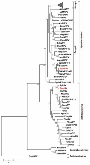 Phylogenetical inference for SporNPV and SporGV genomes. Cladogram based on a concatemer built with the 38 baculovirus core proteins. Group I-alphabaculovirus genus was collapsed to preserve space. SporNPV and SporGV are highlighted in red letters.