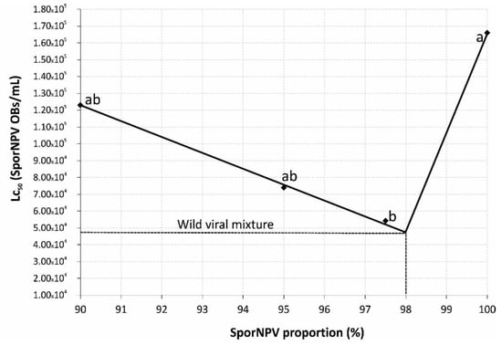 Mean lethal concentrations of artificial mixtures of SporNPV and SporGV. LC50 values followed by different letters are significantly different according to fiducial limits’ comparison. The dotted line corresponds to the extrapolation of SporNPV proportion in the wild viral mixture based in its LC50. Dots with the same letter did not present significant differences based on fiducial limit comparisons.