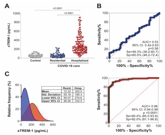 The plotted relative frequency of patients with sTREM-1 showed a high number of events for low levels of sTREM-1 among patients under residential care (mean = 72.32 pg/mL), and a greater number of events for high sTREM-1 levels among hospitalized patients (mean = 303.5 pg/mL), considering an intersection phase between residential and hospitalized care patients with COVID-19 (Figure 1C). These results demonstrated that sTREM-1 could be considered a potential predictive marker of the severity of COVID-19.